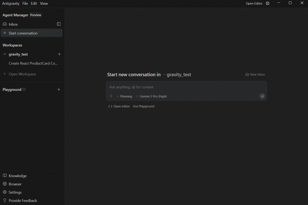 در محیطهای توسعه فعلی، تعامل با یک عامل معمولاً همزمان و داخل یک محیط مشخص انجام میشود؛ مثل ادیتور، مرورگر یا ترمینال. به همین دلیل، نمای اصلی Antigravity نیز یک IDE پیشرفته و آشناست: