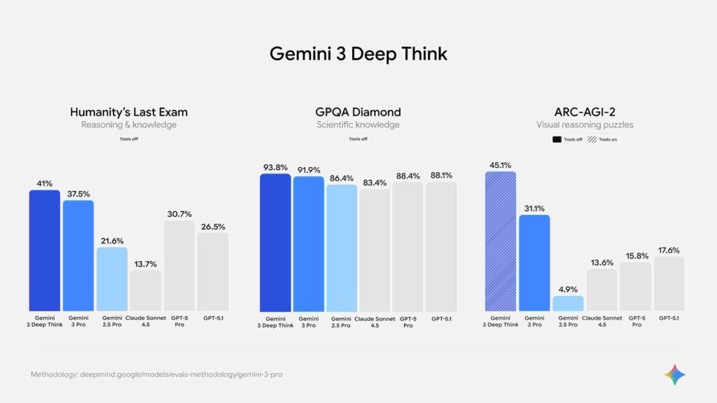در آزمایش‌های مختلف، Gemini 3 Deep Think حتی فراتر از عملکرد چشمگیر Gemini 3 Pro ظاهر شده است. برای مثال: