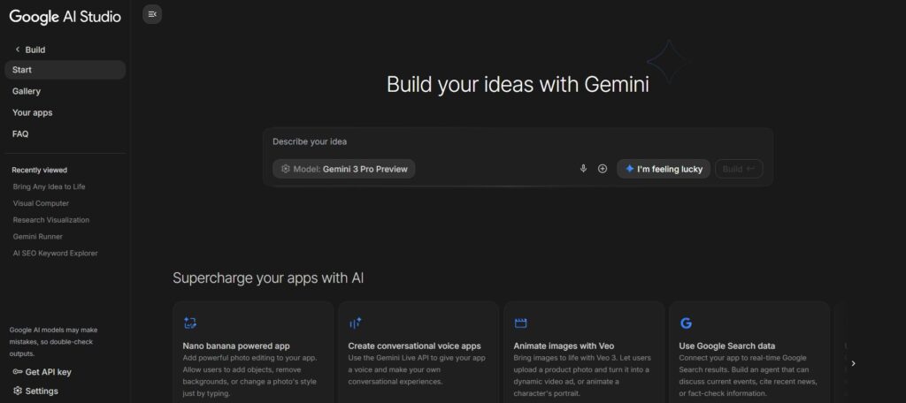 برای استفاده از ویژگی Build با استفاده از جمینای 3 وارد لینک: https://aistudio.google.com/apps شوید و مطابق تصویر پایین ایده خود را وارد کنید و روی دکمه build کیک کنید.