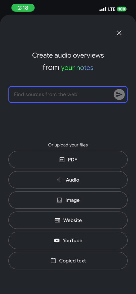 - فعالیت: منبع آموزشی خود (کتاب یا مقاله) را در نوتبوک آپلود کنید. به Audio Overview گوش دهید تا گوشتان با کلمات و لحنها آشنا شود. نوتبرداری از پادکست را فراموش نکنید؛ این یادداشتها خشت اول یادگیری شما در آن هفته هستند. (در واقع میتوان گفت نوت بوک ال ام یکی از بهترین ابزار ها برای یادگیری زبان انگلیسی با هوش مصنوعی است که شما میتوانید داشته باشید.