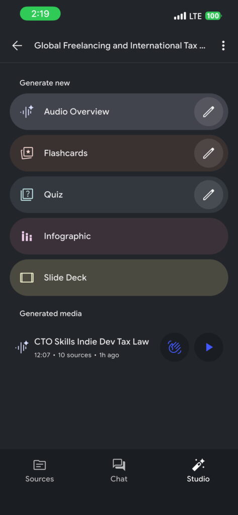 یکی از مهم ترین ابزار ها برای یادگیری زبان انگلیسی با هوش مصنوعی، سرویس هوش مصنوعی NotebookLM است که اخیراً اپلیکیشن موبایل را نیز ارائه کرده است، سرویس مدیریت دانش گوگل میباشد که از هوش مصنوعی در تمامی ابعاد استفاده میکند. برای استفاده از این سرویس کافی است منابع مورد استفاده خود برای یادگیری زبان انگلیسی را به عنوان یک notebook جدید ذخیره کنید و سپس با استفاده از ابزارهای ارائه شده در نوتبوکالام مانند quiz, video info-graphic, podcast, flash cards یادگیری را شروع کنید.